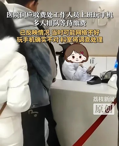 近日,四川甘洛,有东谈主响应县东谈主民病院收费处责任主谈主员在上班时刻玩手机,多东谈主列队恭候缴费。1月6日,院方修起称已向科室主任响应情况,将进行造访措置,并承认“上班玩手机如实不应该”。院方同期解说,那时可能因为网罗不好。